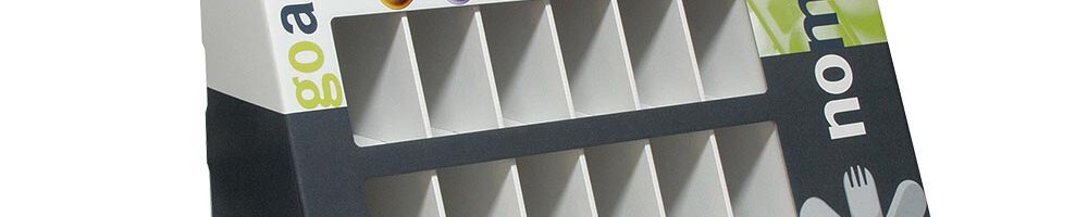 Dieser besondere POS Thekenaufsteller ähnelt in Funktion dem Spenderdisplay als eine Mischung aus Spenderdisplay und Verkaufsrutsche. Als Besonderheit kann hier Aufteilung der Kanäle genannt werden. Durch die zahlreichen Kanäle können die Kunden verschiedenste Ausführungen des gleichen Produkts ganz nach Ihrer Wahl entnehmen. Die Rutsche ist innerhalb des Displays integriert, so dass in der Öffnung jeweils nur ein Produkt erscheint. Dieses wird bei Entnahme vom nächsten Produkt ersetzt. Der Aufsteller besteht aus 230 g/m² Chromoduplexkarton, kaschiert auf E-Wellpappe mit einseitig gedecktem Testliner. Die Bedruckung erfolgte im Offset 4/0 farbig mit 1/0 Drucklack matt..
